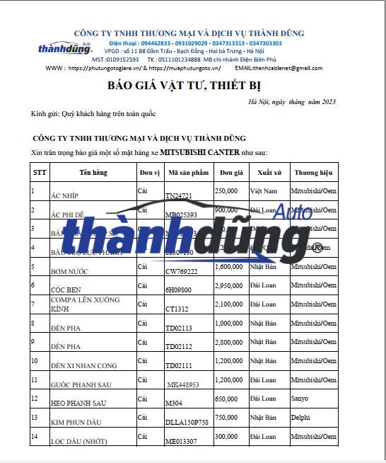 Thành Dũng Auto xin gửi bảng báo giá chi tiết phụ tùng xe Mitsubishi Canter