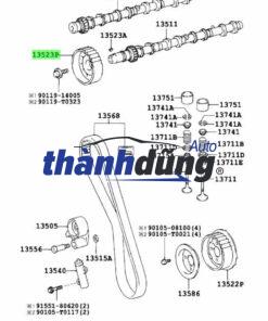 Bánh răng trục cam thường được lắp đặt ở đầu trục cam, phía trước hoặc sau động cơ, tùy thuộc vào thiết kế của từng loại động cơ. Bánh răng trục cam bao gồm các bộ phận chính sau: Vành răng: Là bộ phận có răng cưa, được chế tạo từ vật liệu chịu lực tốt như thép, gang đúc. Vành răng được thiết kế với số lượng răng chính xác để đảm bảo tỷ lệ truyền động 2:1 giữa trục khuỷu và trục cam. Thân bánh răng: Có nhiệm vụ cố định và hỗ trợ vành răng quay. Thân bánh răng thường được làm từ nhôm hoặc thép, được thiết kế với độ chính xác cao để đảm bảo chuyển động trơn tru và giảm tiếng ồn. Rãnh then: Dùng để định vị bánh răng trên trục cam, đảm bảo bánh răng quay đúng vị trí và đồng tốc với trục khuỷu. Lỗ bu lông: Dùng để lắp đặt bánh răng lên trục cam.