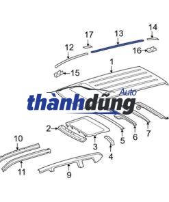 Nẹp nóc xe được lắp đặt dọc theo hai bên nóc xe, cố định bằng keo dán chuyên dụng hoặc ốc vít. Nẹp cao su (nhựa) nóc xe (Roof Moulding Assy) có cấu tạo: Chất liệu: Nẹp nóc xe thường được làm từ cao su hoặc nhựa ABS, có độ đàn hồi tốt, chịu được va đập và các tác động ngoại lực. Hình dạng: Nẹp nóc xe có nhiều kiểu dáng khác nhau, phổ biến nhất là dạng dẹp, dạng U hoặc dạng chữ V. Kích thước: Kích thước của nẹp nóc xe phụ thuộc vào kích thước của nóc xe và kiểu dáng xe. Màu sắc: Nẹp nóc xe có nhiều màu sắc để lựa chọn, phổ biến nhất là màu đen, trắng, xám, phù hợp với màu sơn của xe.